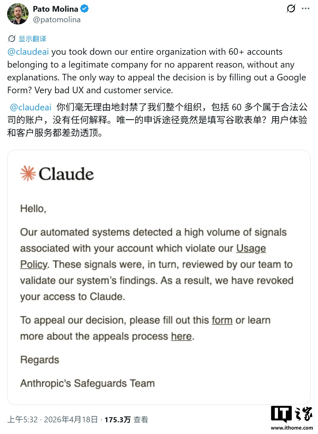 报道称该事件发生于上周六,在未提供具体说明的情况下,Anthropic 切断 Belo 公司访问 Claude 权限,仅以模糊的“违反使用政策”为由,通过自动邮件通知对方。IT之家附上相关截图如下: